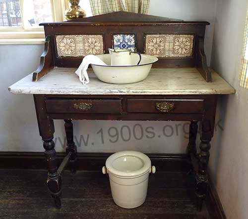 Washstand with the customary marble top and the matching jug and bowl, photographed in the Museum of Nottingham Life. The jug and bowl set were made of enamel which would have been more robust and cheaper than decorated china.