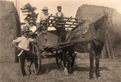 Once the grass for hay was cut, it was left strewn on the ground to dry in the sun before being collected. The timing was critical and depended on the weather. The moisture content had to be 14% or less, otherwise the bacteria in the grass would multiply in the haystack and make it so hot that it would catch fire. At that time, the correct moisture content would have been a matter of judgement by experienced farmhands.